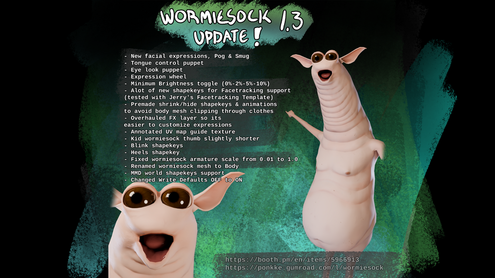 Wormiesock avatar for VRChat. Excellent performance ranking for PC, Good for Quest and can be uploaded and used as a fallback avatar. Built to be easy to set up and modified. Shaders set up for both PC and Quest.